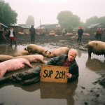 real film photo with flash, low quality blurry mobile photo style, dutch angle shot, A tourist is lost in the village somwhere in ukraine, with pigs all around him, a pigs farm and wet puddles mud ,𝕧𝕝𝕒𝕕𝕚𝕞𝕚𝕣 𝕡𝕦𝕥𝕚𝕟 holding sign that says text: "SUP 2CH" . . . .